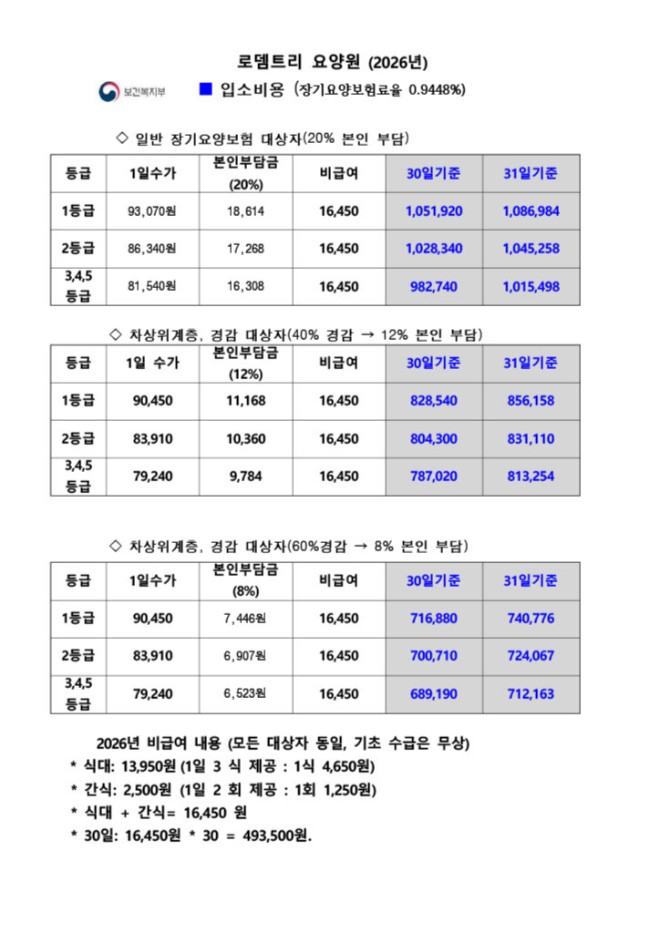 -2026년 로뎀트리 요양원 입소 비용을 알려 드립니다. 1. 장기 요양 보험료율: 0.9448% 인상 2. 2026년 비 급여 식대: 250원 인상되었음을 공지합니다. |